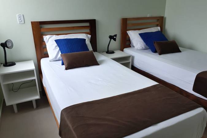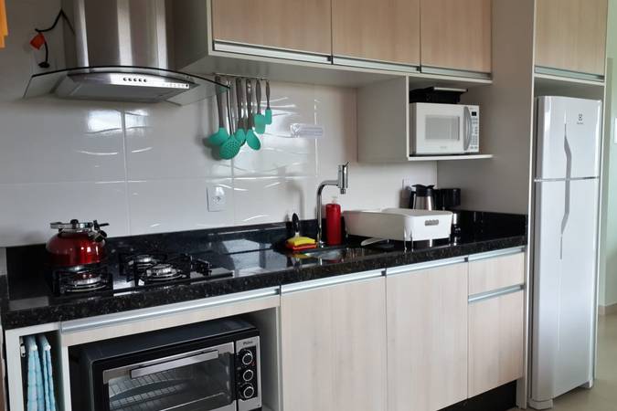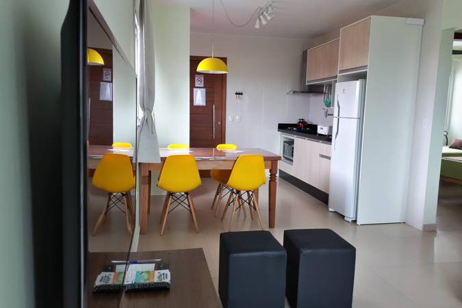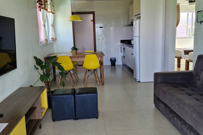 2 quartos + 2 banheiros + sala com TV + cozinha equipada e sacada com churrasqueira. Conforto com cenário encantador!